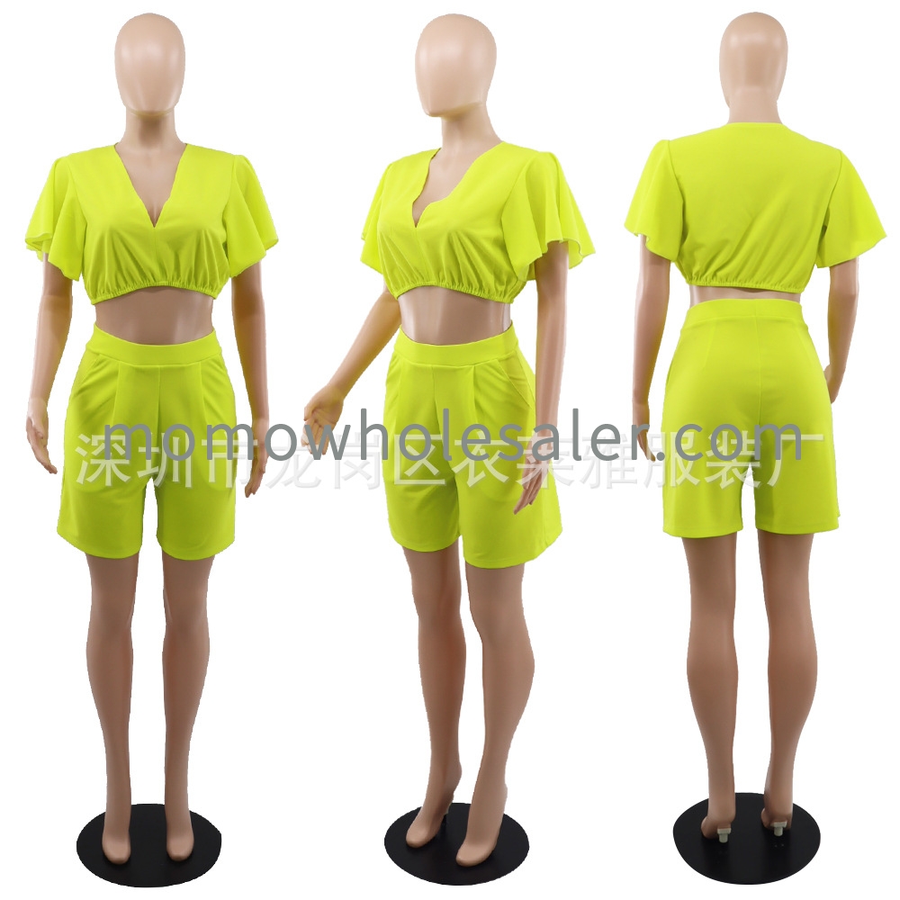 9758 ruffle short V-neck top casual shorts summer two-piece set