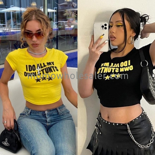 T2170 Letter Print Cropped Navel Short Sleeve T-Shirt